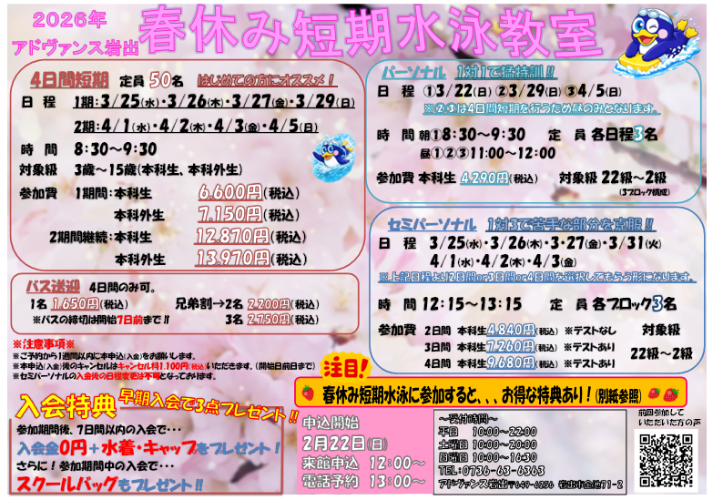 今回は春休み短期水泳教室にご参加いただけるとお得な特典が付いてきます!!